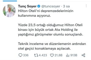 İzmir Büyükşehir Belediye Başkanı Tunç Soyer’, ‘in sosyal medyadan yaptığı açıklama şu şekilde: “Hilton Oteli’ni depremzedelerimizin kullanımına açıyoruz. Yüzde 23,5 ortağı olduğumuz Hilton Oteli binası için büyük ortak Ata Holding ile yaptığımız görüşmeler olumlu sonuçlandı. Teknik inceleme ve düzenlemenin ardından otel geçici konaklamaya açılacak.”